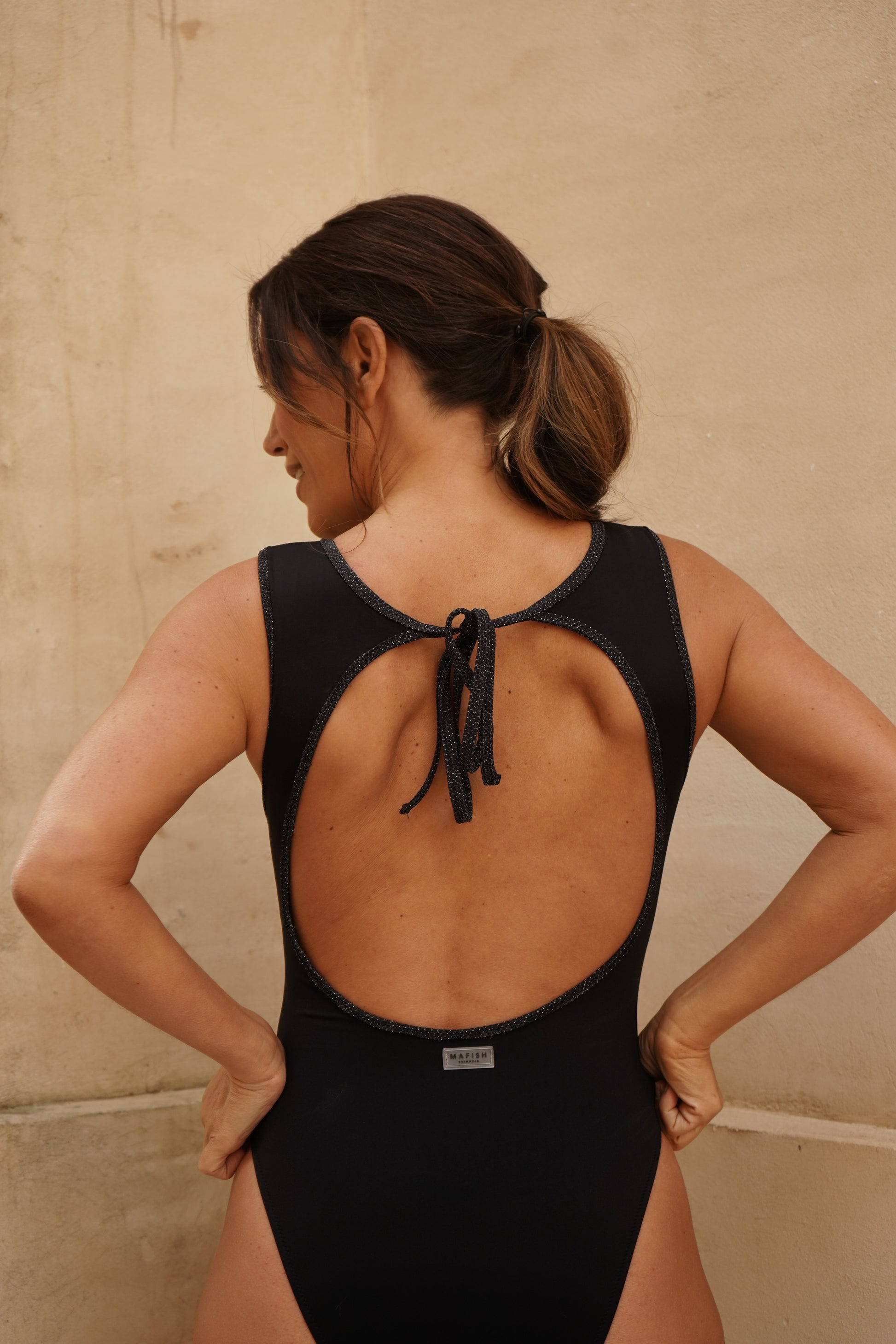 Traje de baño halter con detalle pecherín con vivo y espalda redonda abierta. Lazo en el cuello lleva costura de refuerzo invisible para el pecho y cascos extraibles.