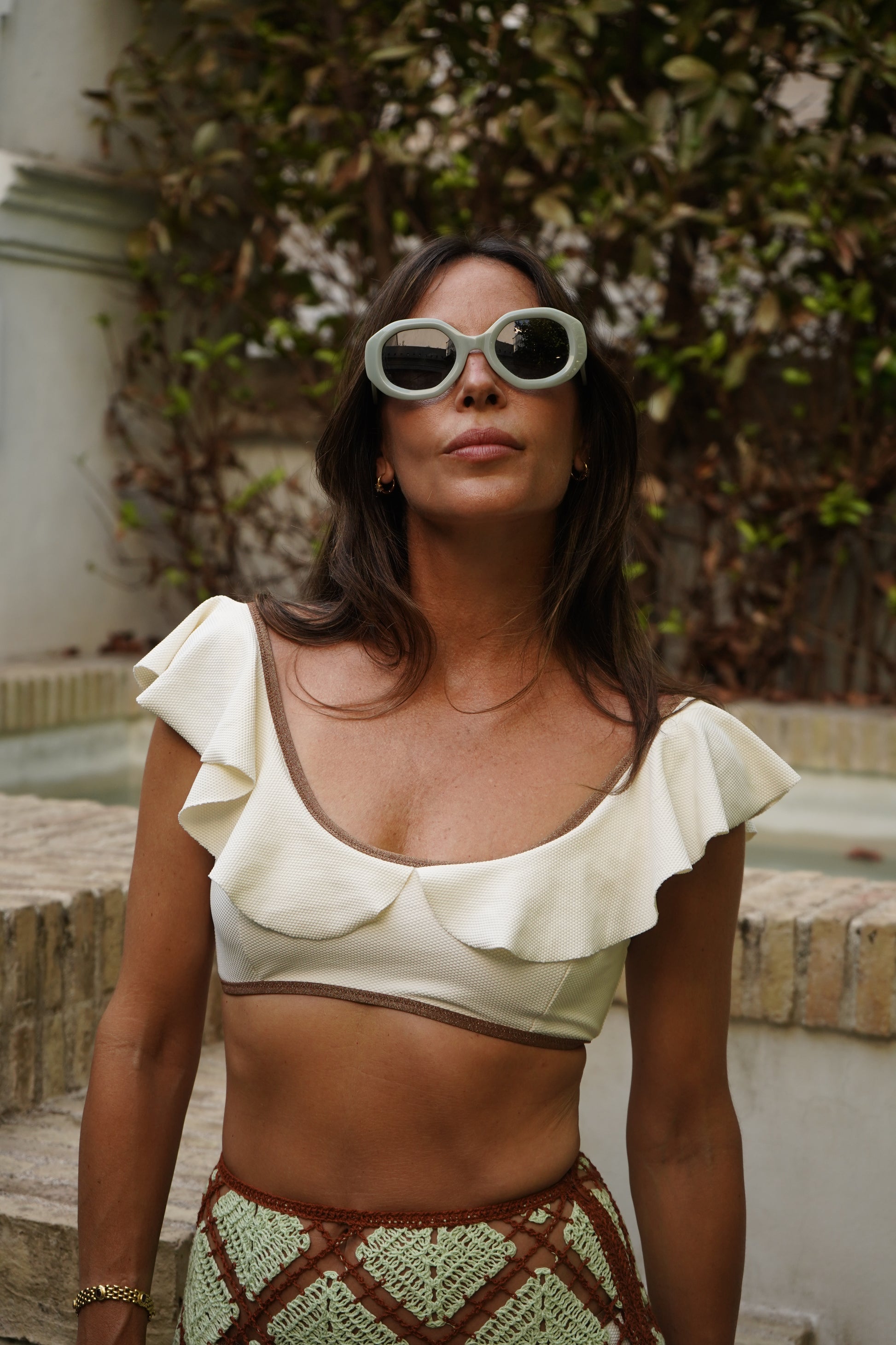 Bikini detalle volante anudado en la espalda, vivos en top y braguita.